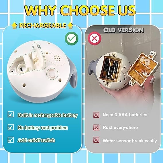• Save Money – no need extra batteries: ATTENTION!!! The cost of the batteries you purchase is much higher than the price of our toddler 2-4 whale bath toy! We use a high-quality rechargeable battery, which can spray water for 120 minutes after fully charged. The water spraying time of our rechargeable battery is 4 times that of 3 pcs AAA batteries, which saves about 12 batteries so it is very value for money. And do not have to replace new batteries anymore
