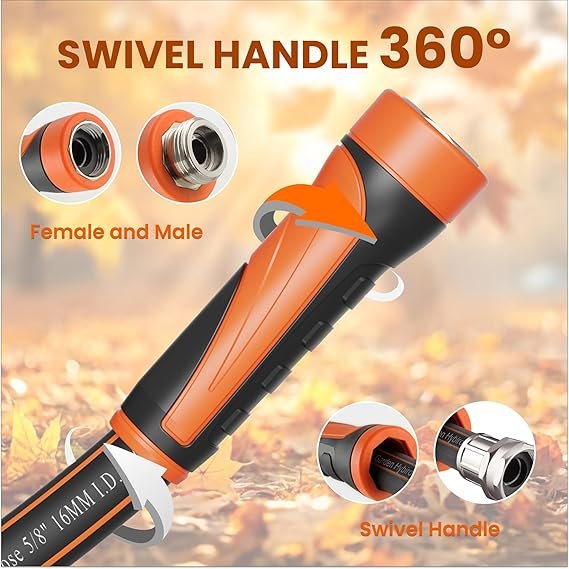 • Swivel Handle – The movable handle allows the hose to rotate freely to prevent twisting, the handle can also fix the fitting to make the connection with faucet/nozzle/sprinkler more easily and effortlessly.